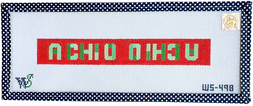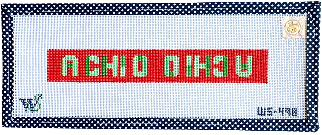 Hand-painted on 13 mesh Zweitgart canvas, the design measures approximately 9.5" wide by 1.5" tall. Perfect for a beginner-level project.