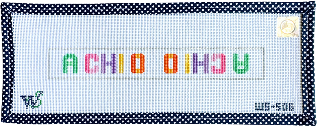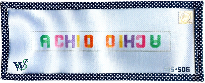 Hand-painted on 13 mesh Zweitgart canvas, the design measures approximately 9.5" wide by 1.5" tall. Perfect for a beginner-level project.