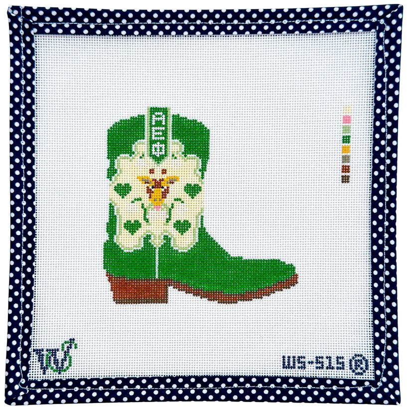 Hand-painted on 18 mesh Zweitgart canvas, the design measures approximately 4" wide by 4" tall.