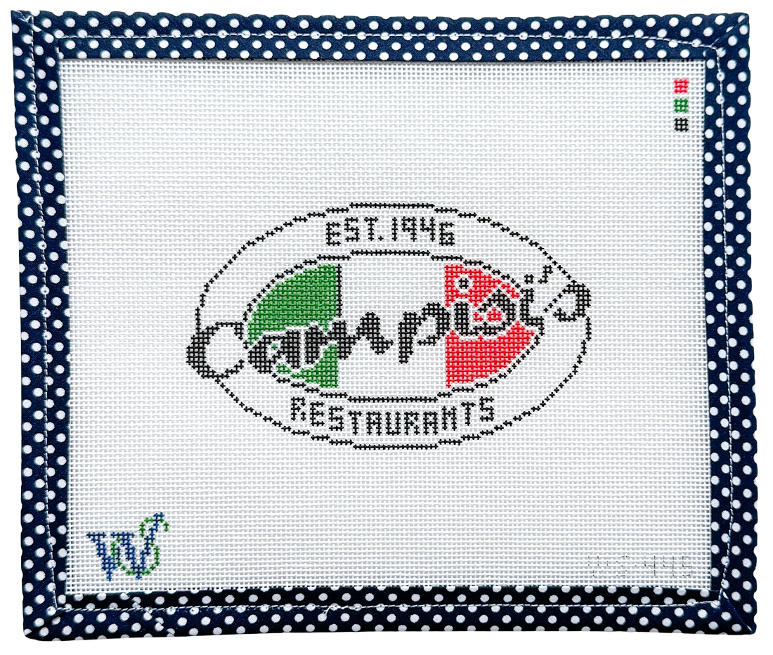 Hand-painted on 18 mesh Zweitgart canvas, the design measures approximately 4.5" wide by 3" tall.