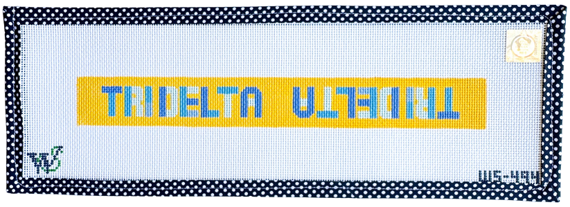 Hand-painted on 13 mesh Zweitgart canvas, the design measures approximately 9.5" wide by 1.5" tall. Perfect for a beginner-level project.