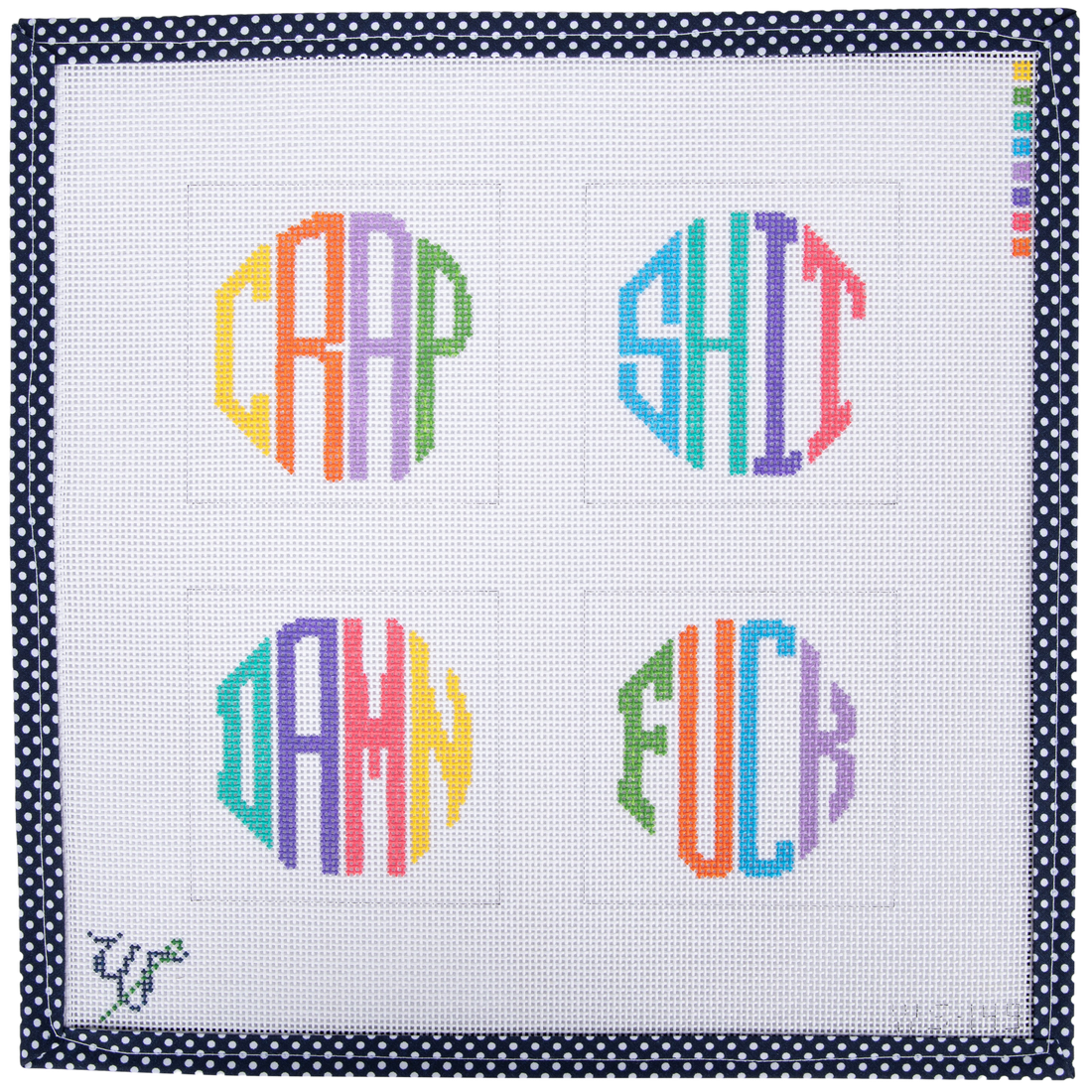 Offering hand-painted and stitch-printed on 13 mesh Zweitgart canvas, each coaster design measures approximately 4" wide by 4" tall.