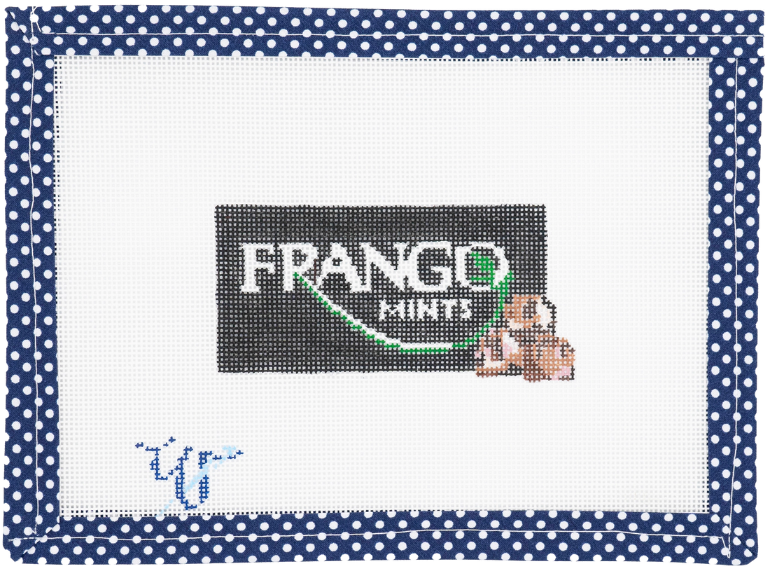 Hand-painted on 18 mesh Zweitgart canvas, the design measures approximately 4" wide by 2" tall.