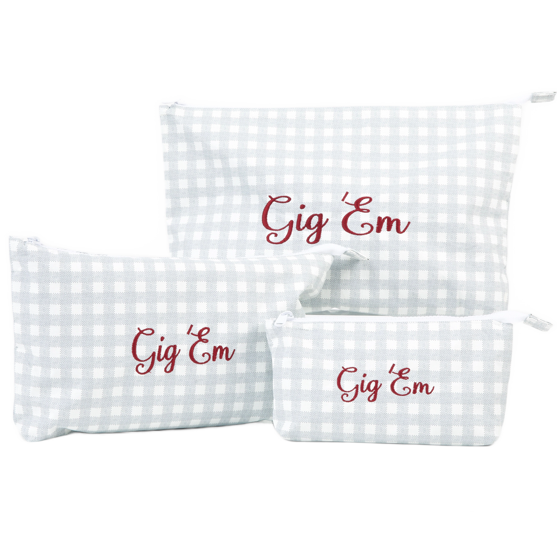 Show off your Aggie pride with the ultimate Bag Bundle! Featuring three sizes—Small, Medium, and Large—each embroidered with the same design, this bundle is perfect for organizing projects, makeup, travel essentials, craft supplies, and more.