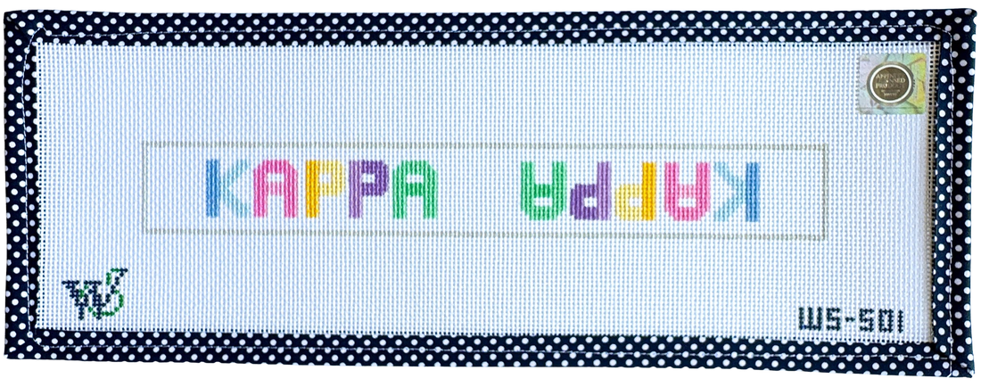 Hand-painted on 13 mesh Zweitgart canvas, the design measures approximately 9.5" wide by 1.5" tall. Perfect for a beginner-level project.