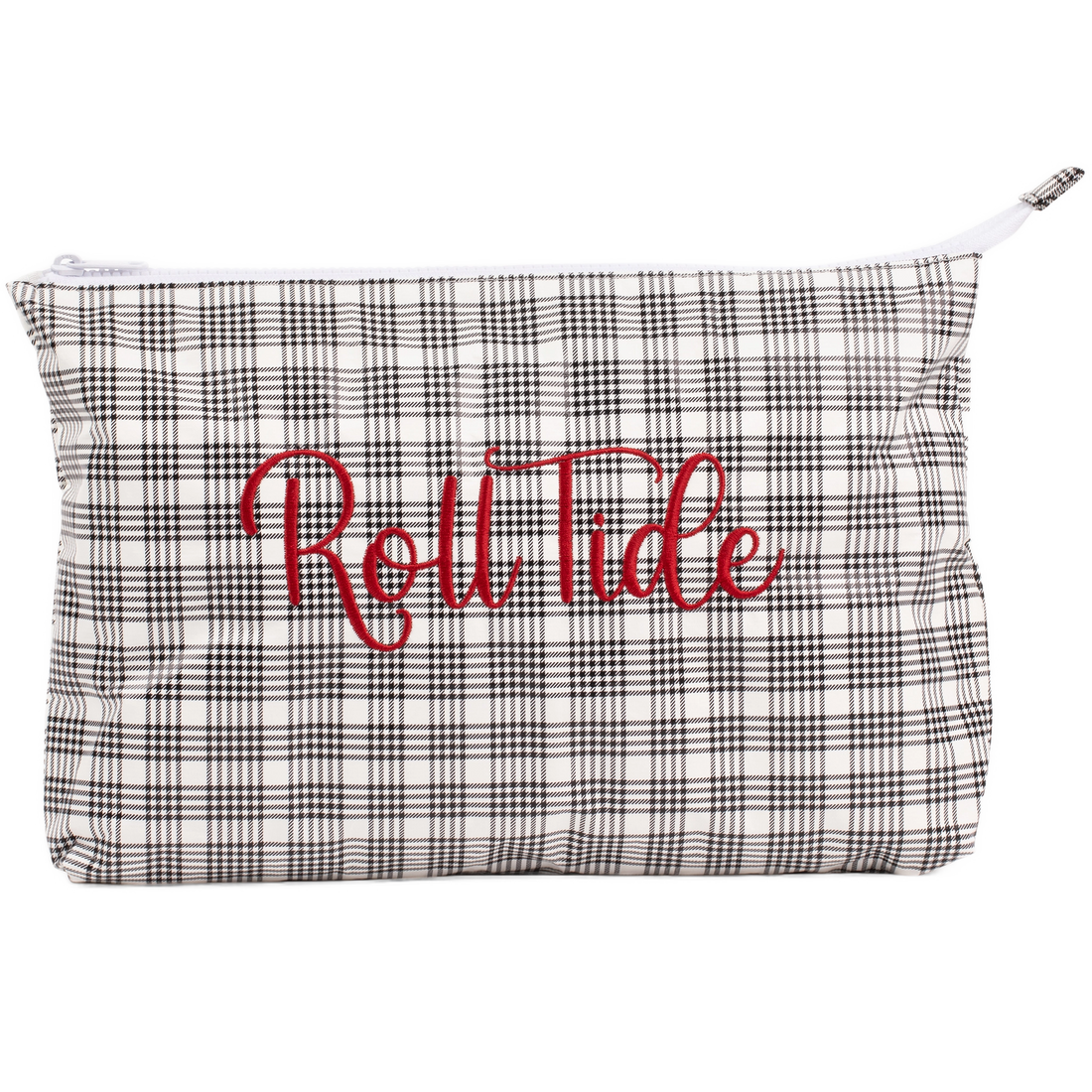 Show off your Alabama pride with our large embroidered stash bag, perfect for organizing projects, travel essentials, makeup, school supplies, and more.