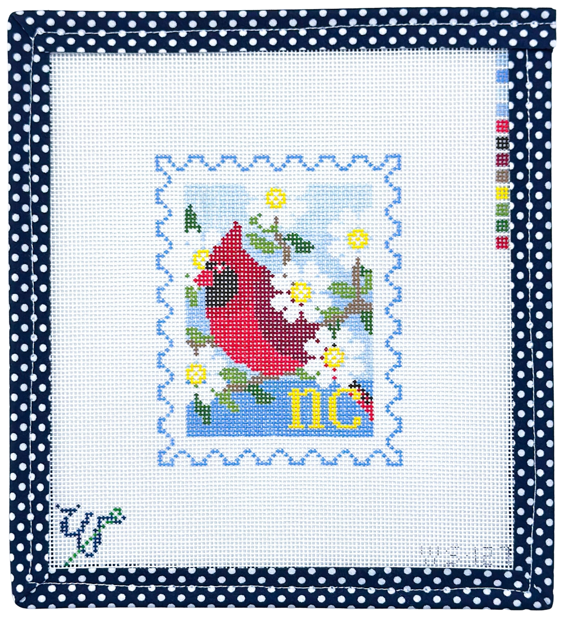 Hand-painted on 18 mesh Zweitgart canvas, the design measures approximately 3.5" wide by 4.25" tall.
