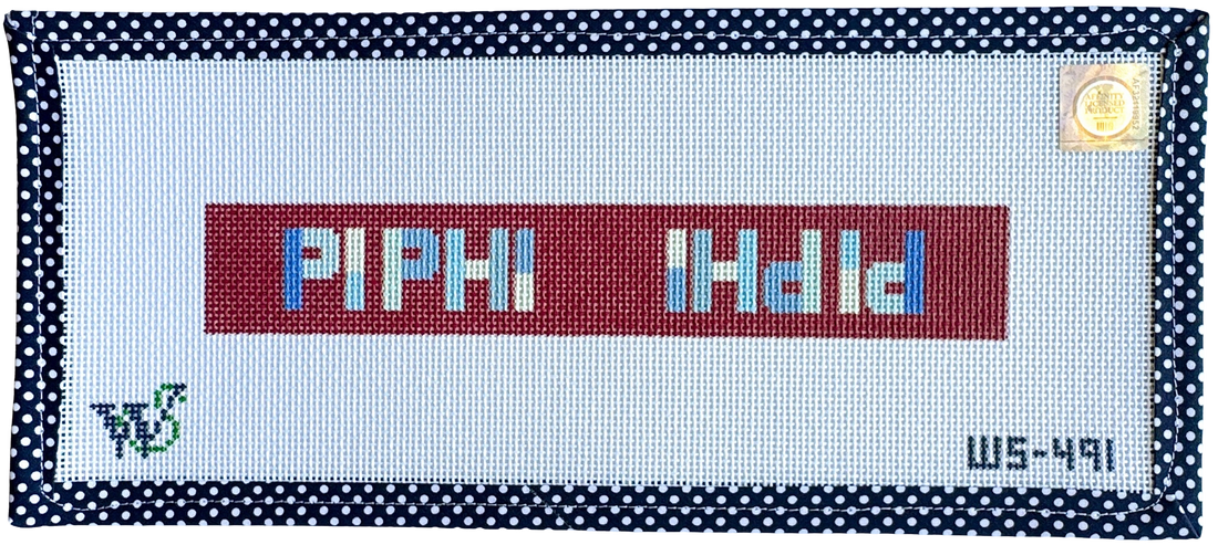 Hand-painted on 13 mesh Zweitgart canvas, the design measures approximately 9.5" wide by 1.5" tall. Perfect for a beginner-level project.