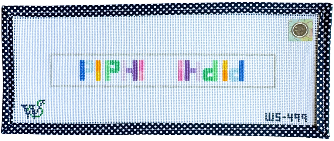 Hand-painted on 13 mesh Zweitgart canvas, the design measures approximately 9.5" wide by 1.5" tall. Perfect for a beginner-level project.