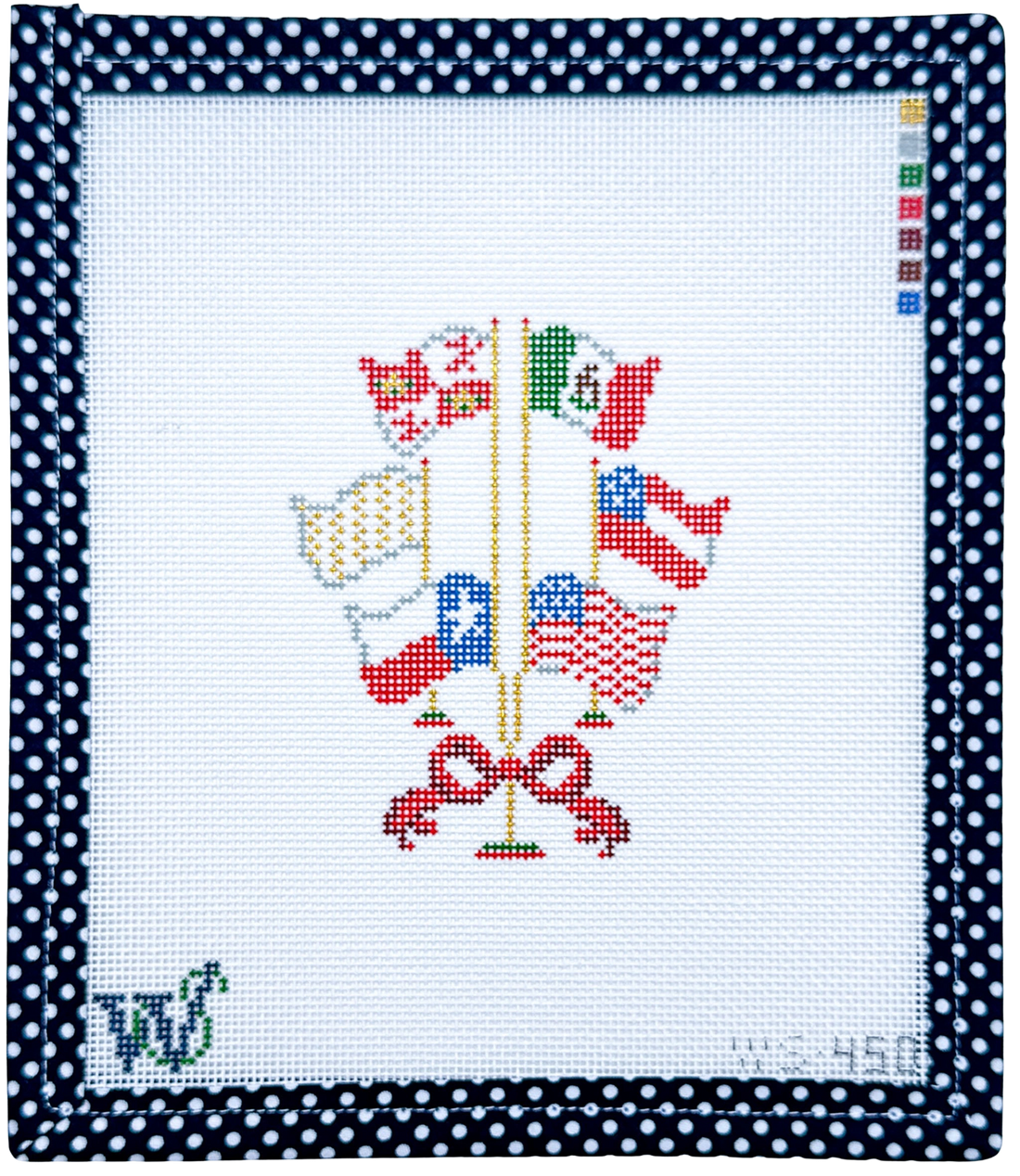 Hand-painted on 18 mesh Zweitgart canvas, the design measures approximately 3" wide by 4" tall.