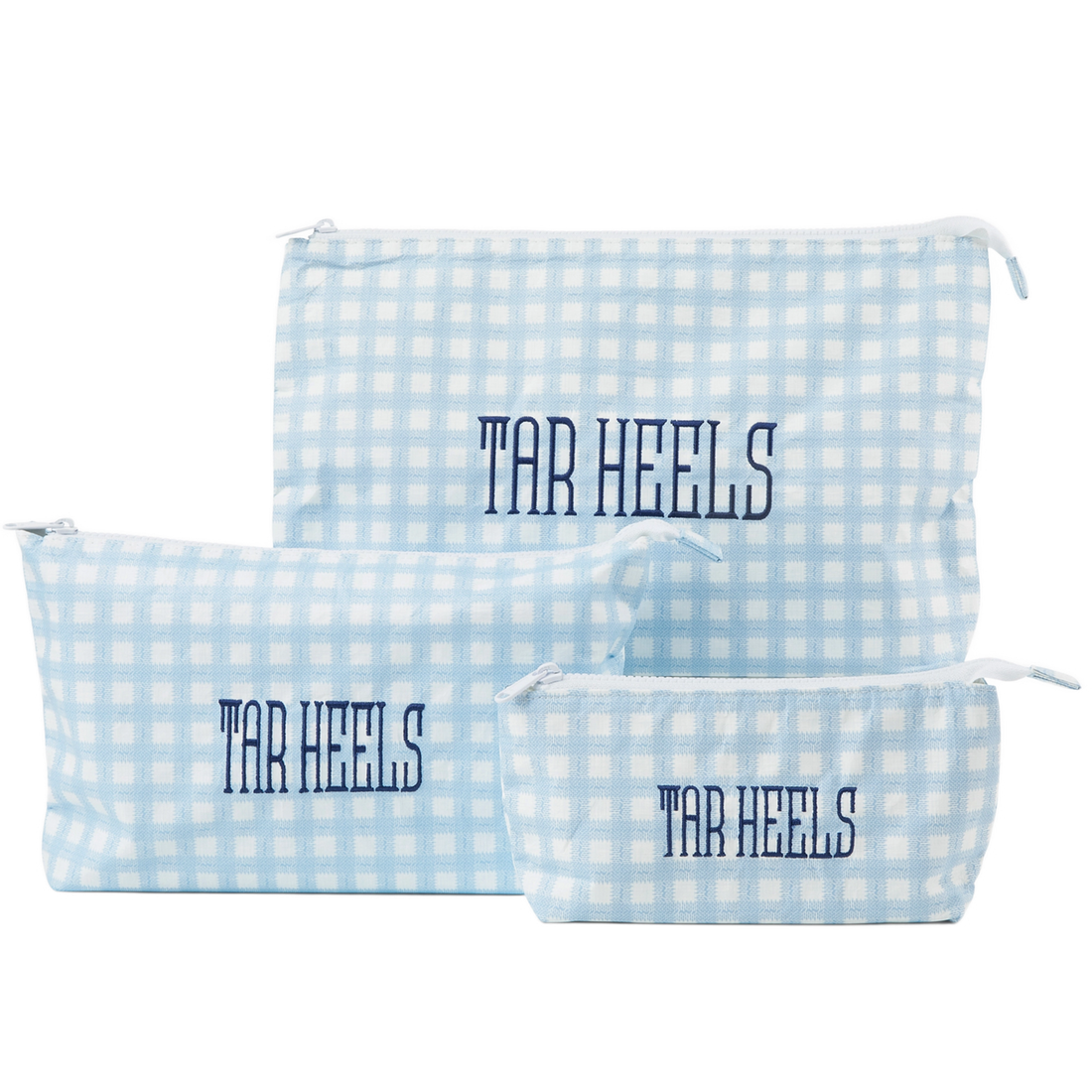 Show off your North Carolina pride with the ultimate Bag Bundle! Featuring three sizes—Small, Medium, and Large—each embroidered with the same design, this bundle is perfect for organizing projects, makeup, travel essentials, craft supplies, and more.