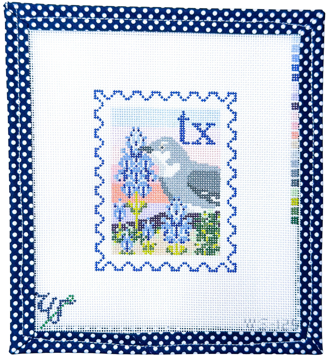 Hand-painted on 18 mesh Zweitgart canvas, the design measures approximately 3.5" wide by 4.25" tall.