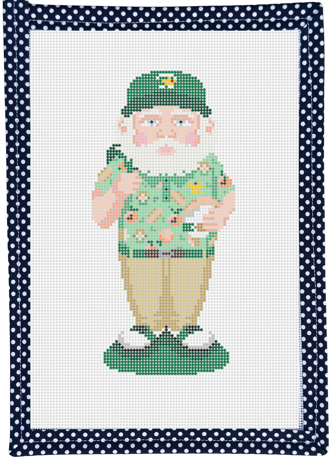 Hand-painted on 18 mesh Zweitgart canvas, the design measures approximately 2.75" wide by 6" tall. All gnomes have an allowance on the green to include the year.
