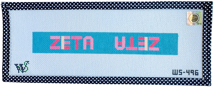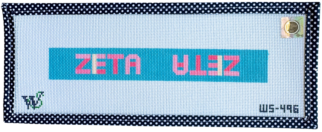 Hand-painted on 13 mesh Zweitgart canvas, the design measures approximately 9.5" wide by 1.5" tall. Perfect for a beginner-level project.